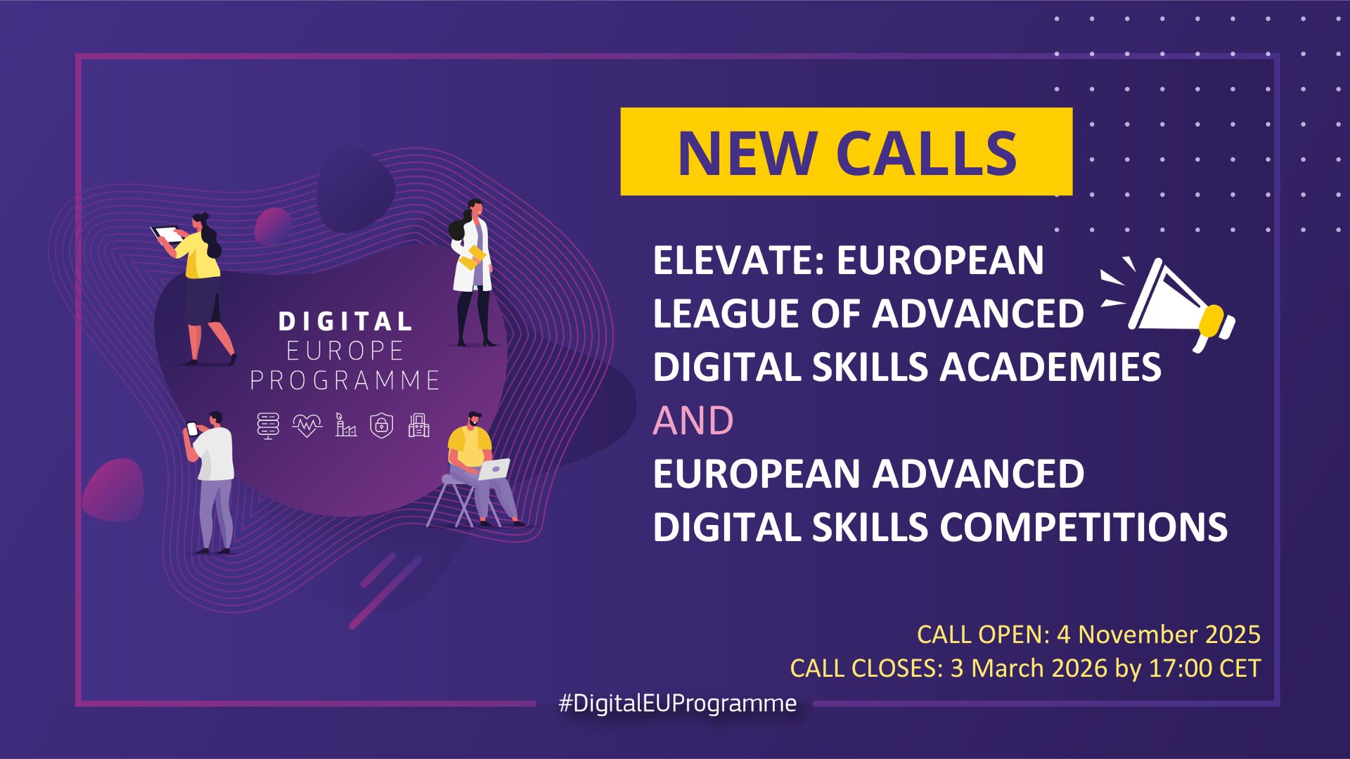 1. ELEVATE: Europos pažangių skaitmeninių įgūdžių akademijų lyga (DIGITAL-2026-SKILLS-09-LEAGUE-OF-ACADEMIES): pagal šį kvietimą bus sukurta koordinuota Europos sistema, jungianti dirbtinio intelekto, kibernetinio saugumo, kvantinių technologijų, virtualiųjų pasaulių ir puslaidininkių iniciatyvas. Skatindama sinergiją su kitomis atitinkamomis ES iniciatyvomis įgūdžių srityje, pavyzdžiui, Skaitmeninių įgūdžių ir užimtumo informavimo sistema, ELEVATE siekia racionalizuoti ir sustiprinti pastangas pagrindinėse pajėgumų srityse ir sukurti darnią ir bendradarbiavimu grindžiamą aukšto lygio skaitmeninių įgūdžių ekosistemą Europoje.